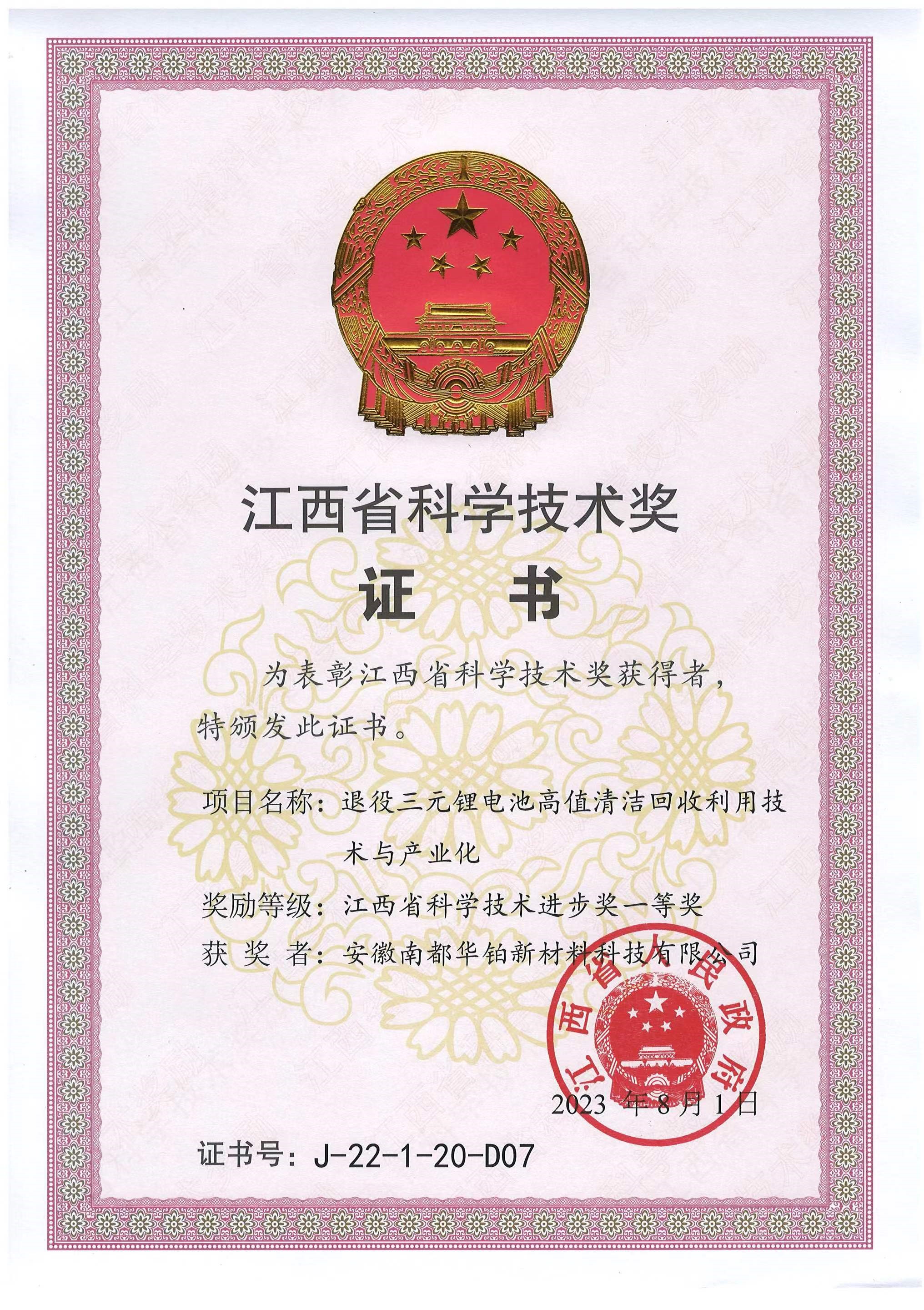 此次荣获江西省科学技术进步奖一等奖,是政府部门及业内对华铂新材料科技研发方面的肯定,也必将推动公司技术创新方面迈向新的台阶。未来,华铂新材料将加快科技成果转化力度,持续为锂电回收产业的高质量发展提供科技支撑。
