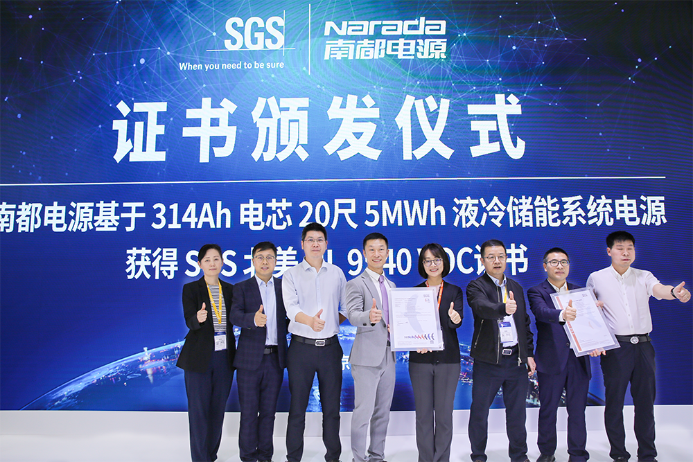 在展台发布区,国际公认的测试、检验和认证机构SGS受邀,分别为南都314Ah储能专用电池和20尺5MWh液冷储能系统,颁发了UL1973和UL9540VOC认证证书。