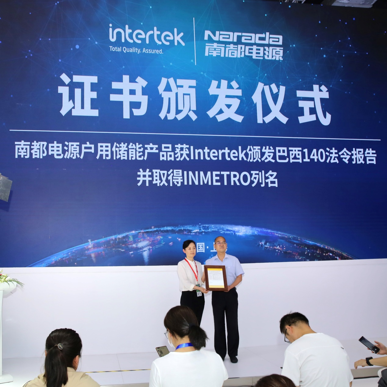 在展台发布区,全球领先的质量和安全服务机构INTERTEK受邀,为南都NESR系列户用储能产品颁发INMETRO证书。证书的获得为该产品顺利进入巴西市场提供了强有力的安全保障。