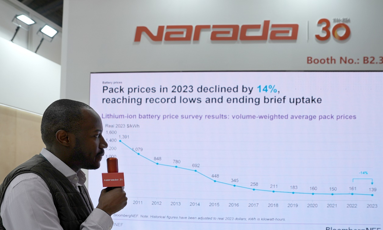他表示,全球电池需求预计将持续增长到2035年,其中锂电池的增长尤为显著。中国在电池供应链中占据主导地位,掌握了超过80%的核心资源。同时,他还介绍说,随着锂价走低,锂电池价格持续下探,2023年锂电池包的价格同比下降14%,创下历史新低。