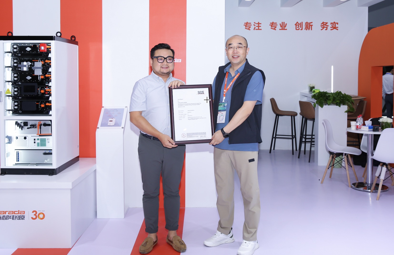 在展台发布区,国际公认的测试、检验和认证机构SGS受邀,为南都IDC用高压锂电系统,颁发了 UL 9540A 、 IEC 62619和 IEC 62477-1证书。