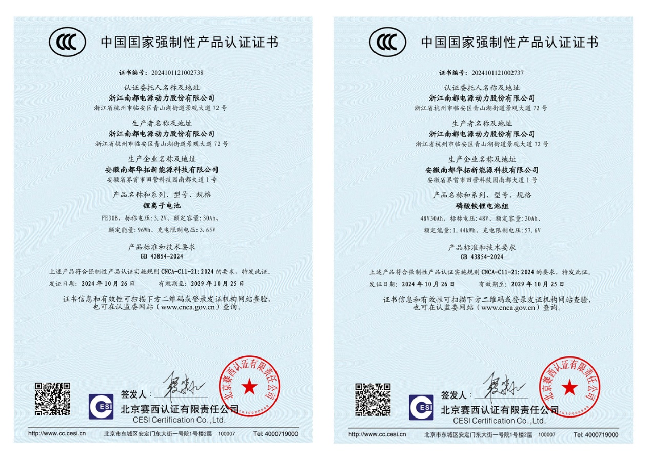 此次获得CCC认证,标志着南都电动自行车锂电池满足过充、过放、短路、针刺等安全要求,电池组的电气安全、机械安全、环境安全、热扩散、互认协同充电等符合强制性国家标准规定要求。