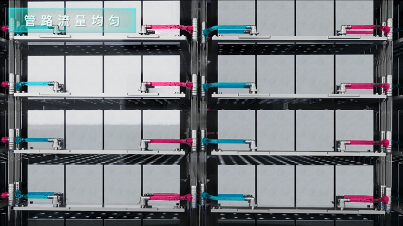 针对这一特点,南都液冷储能系统的多级变径液冷管路设计能确保温度的均匀分布,有效提升散热效率,同时液冷双系统备份技术能确保一套液冷设备在发生故障时,另一套系统可以正常工作,确保电池的稳定工作。