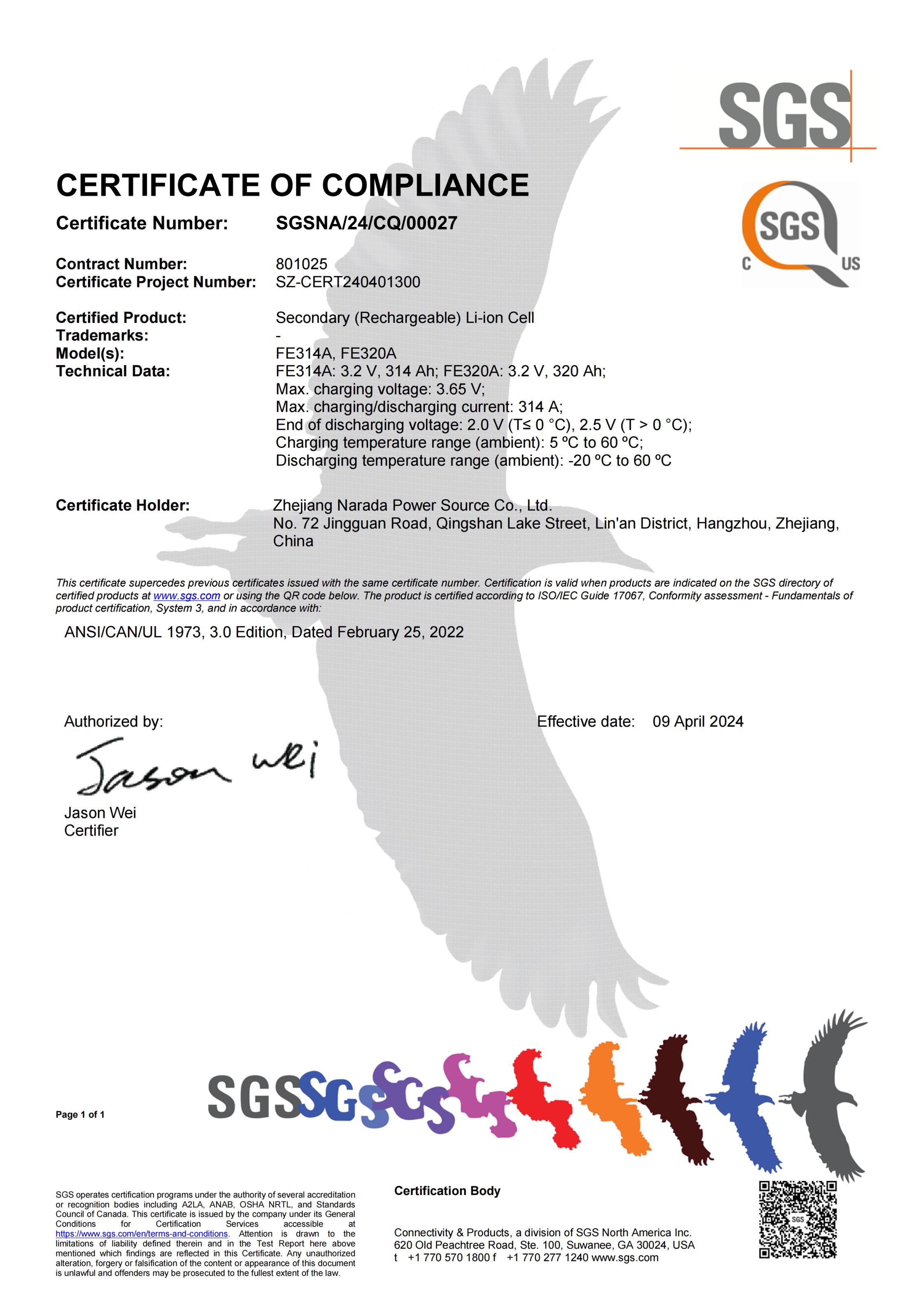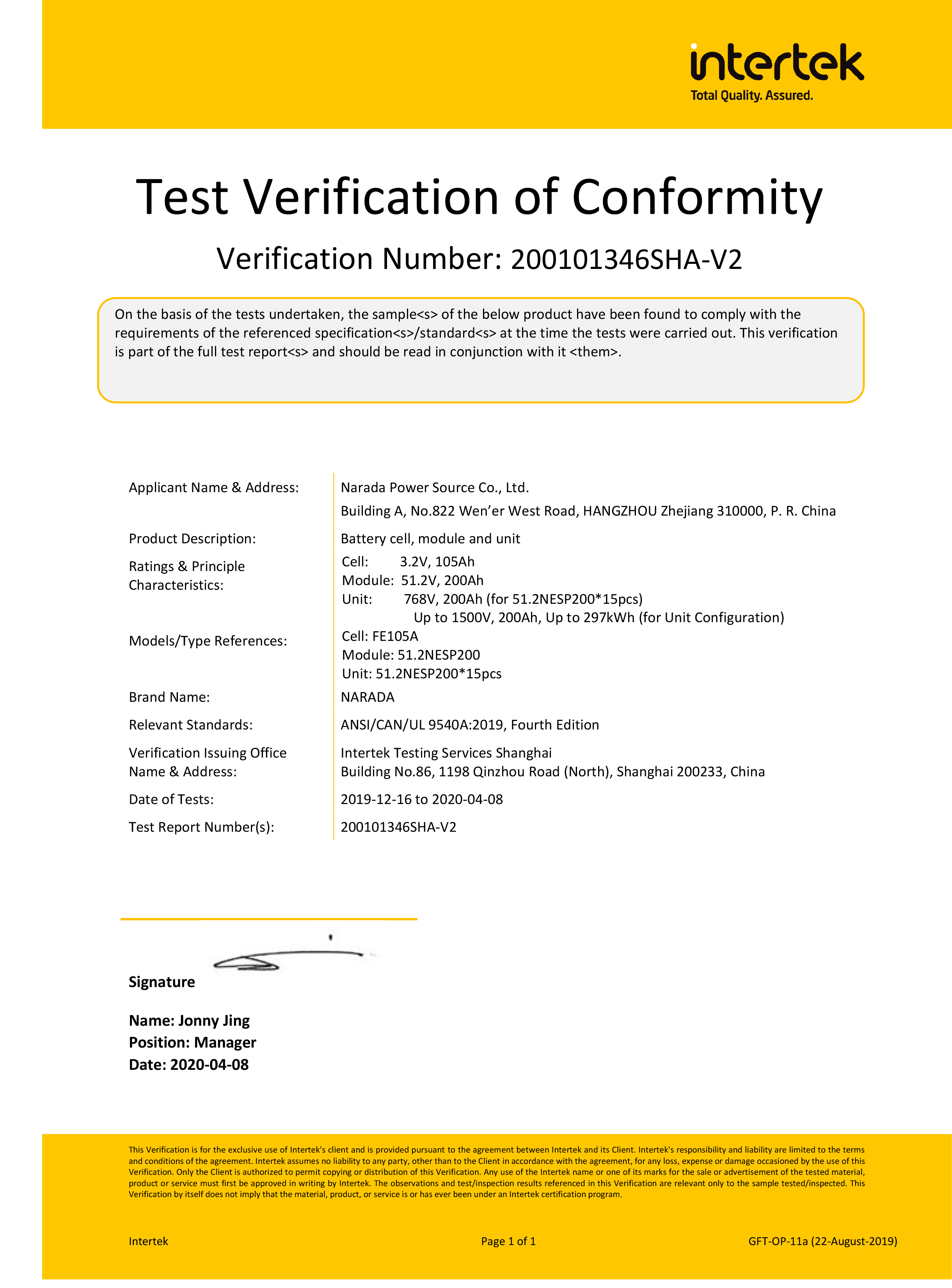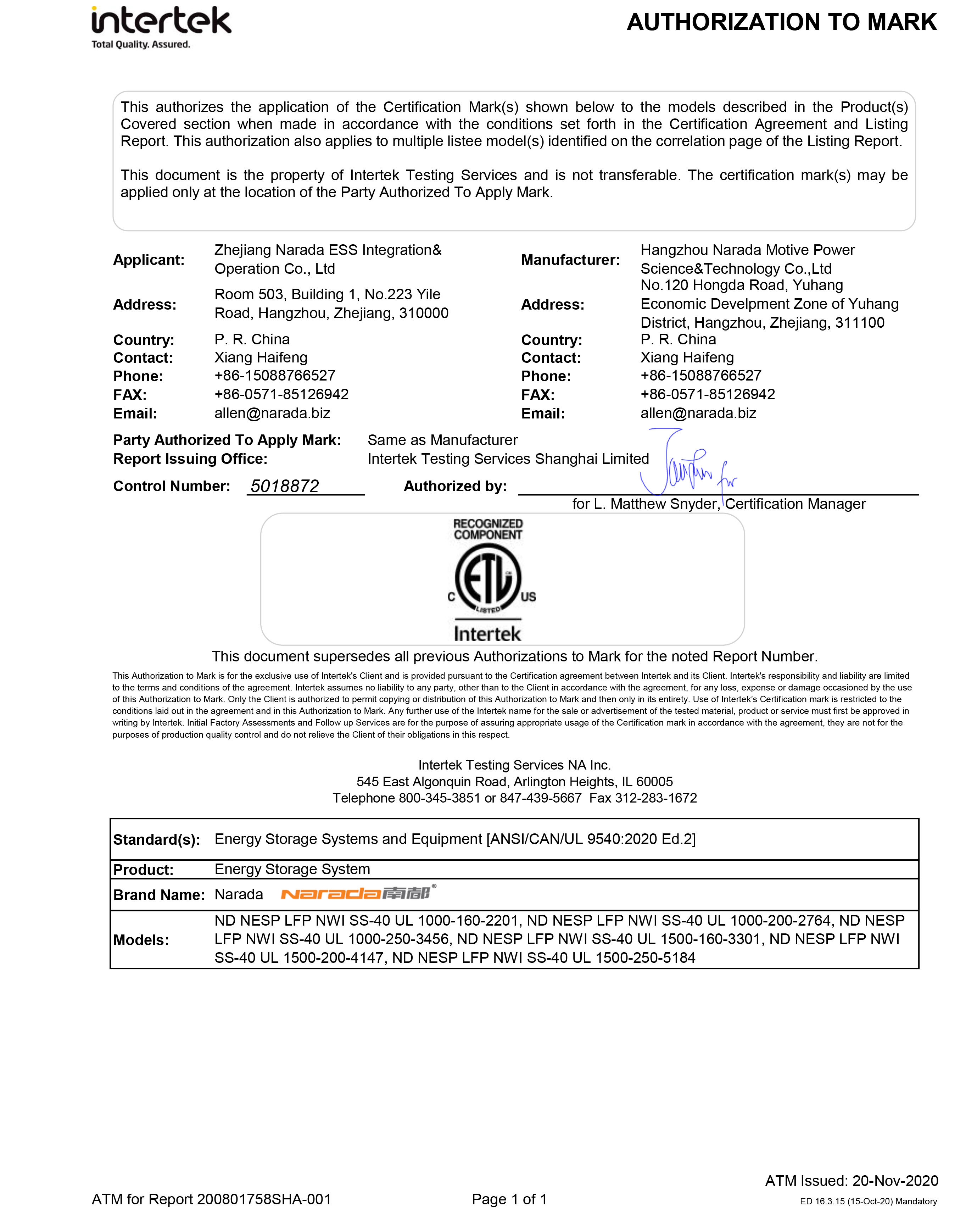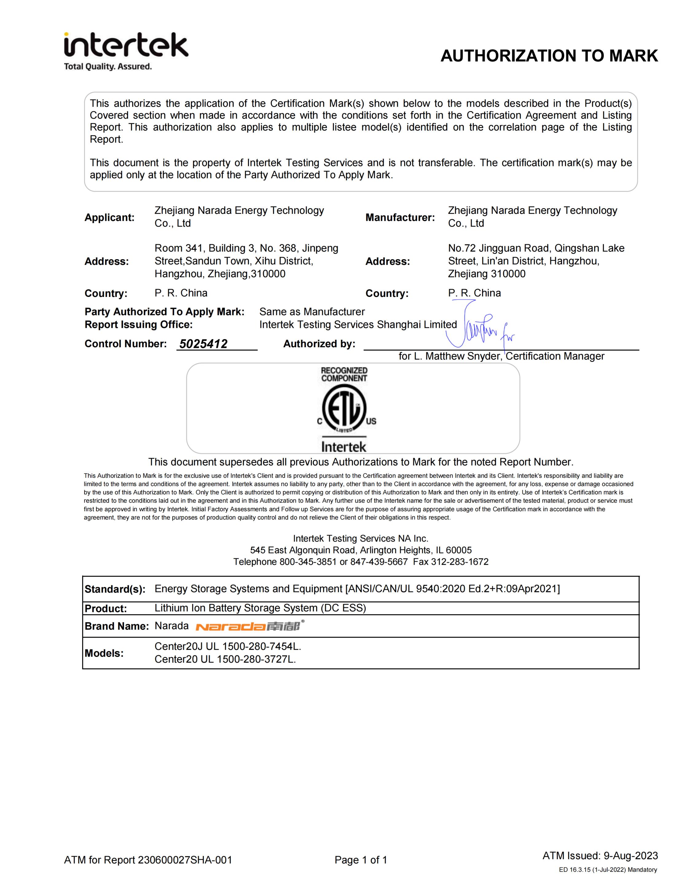 为全球第一批通过MW级集装箱储能系统UL9540、UL9540A认证的企业。通过UL9540、UL9540A认证,意味着南都储能系统在全球范围内具有极佳的认可度。