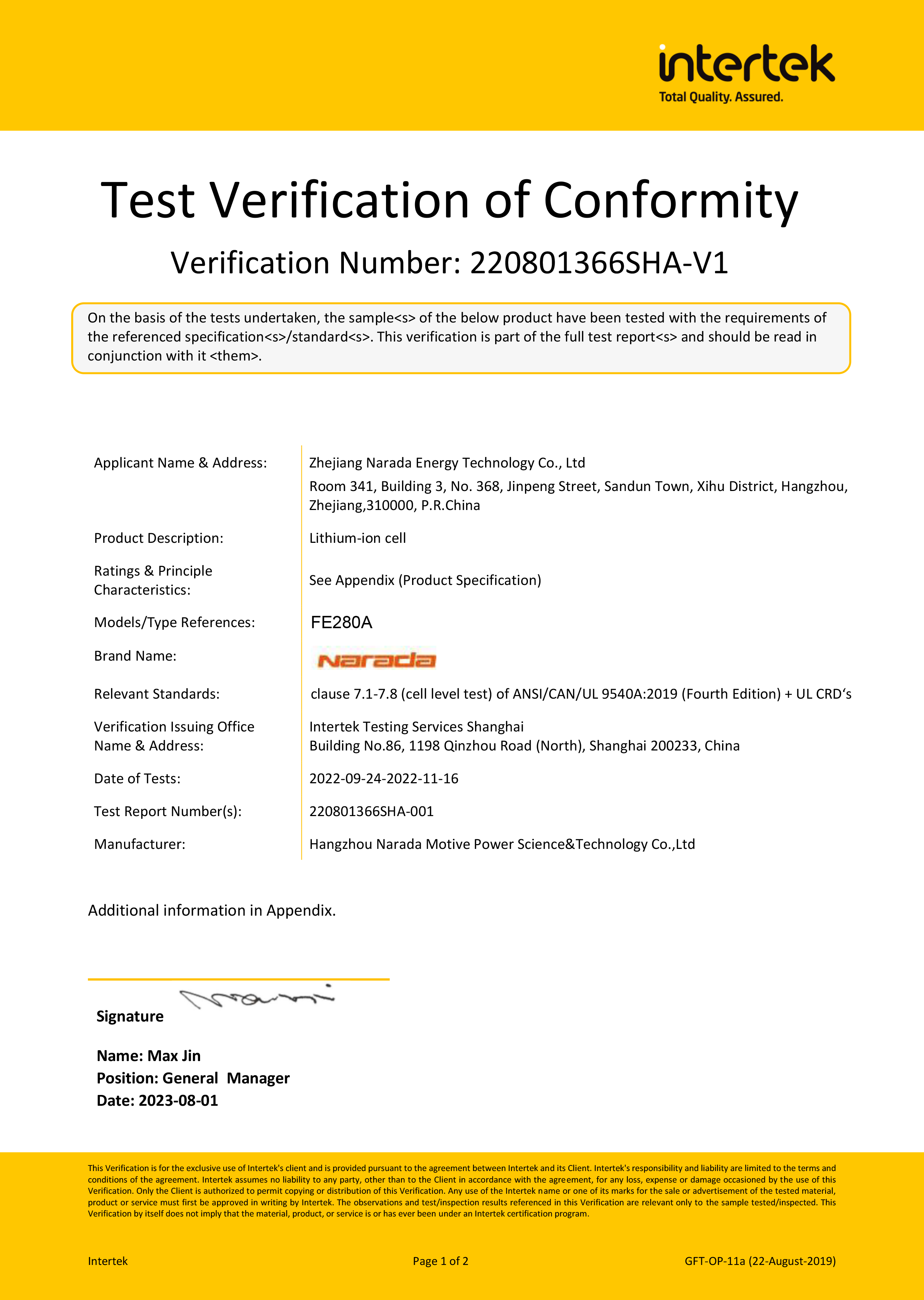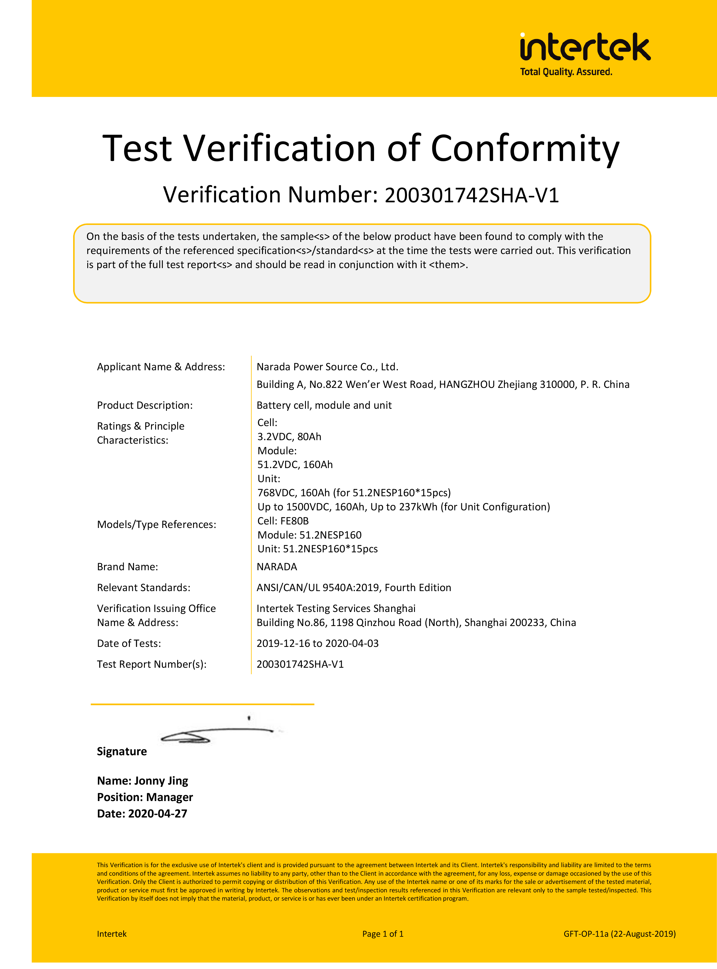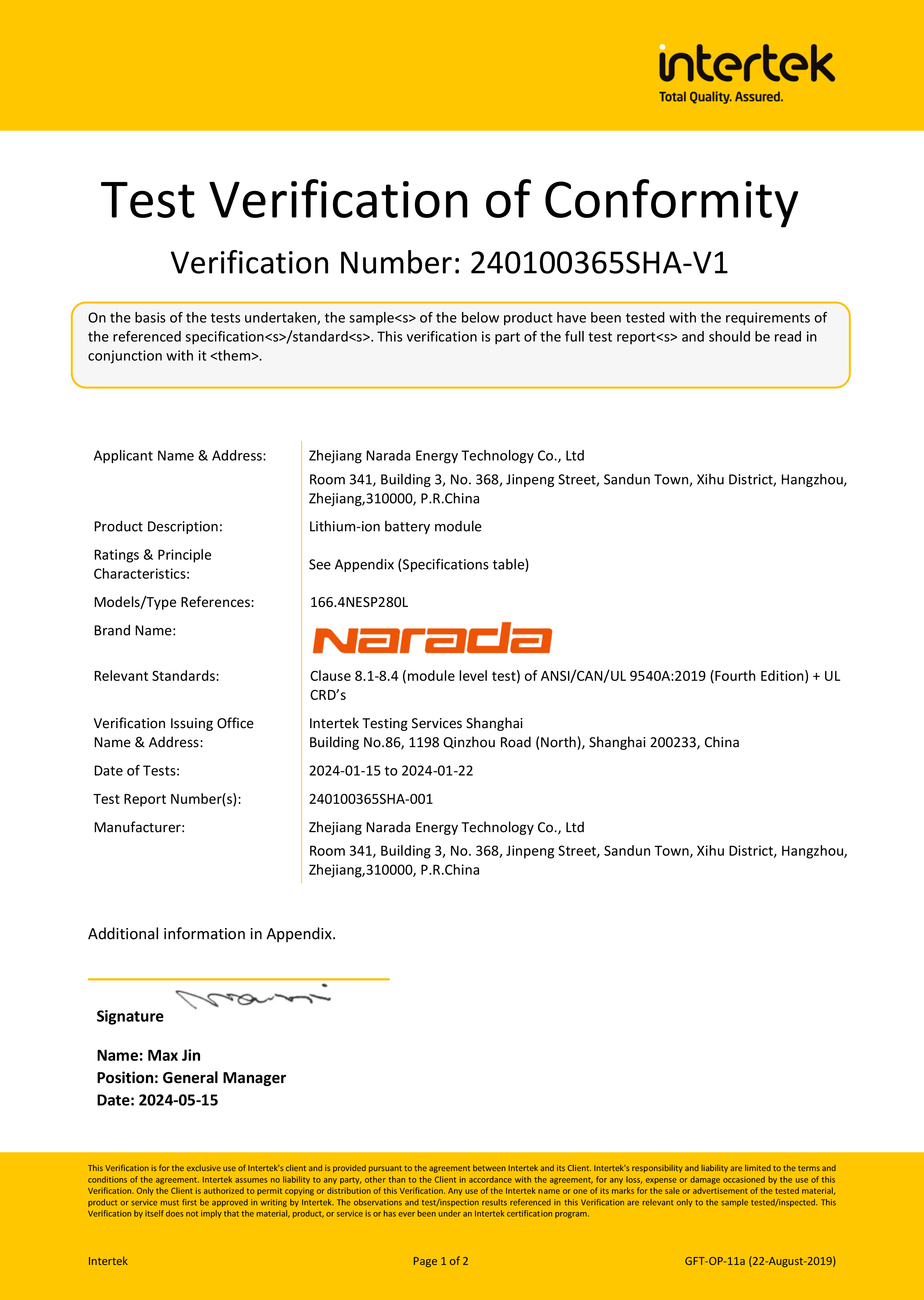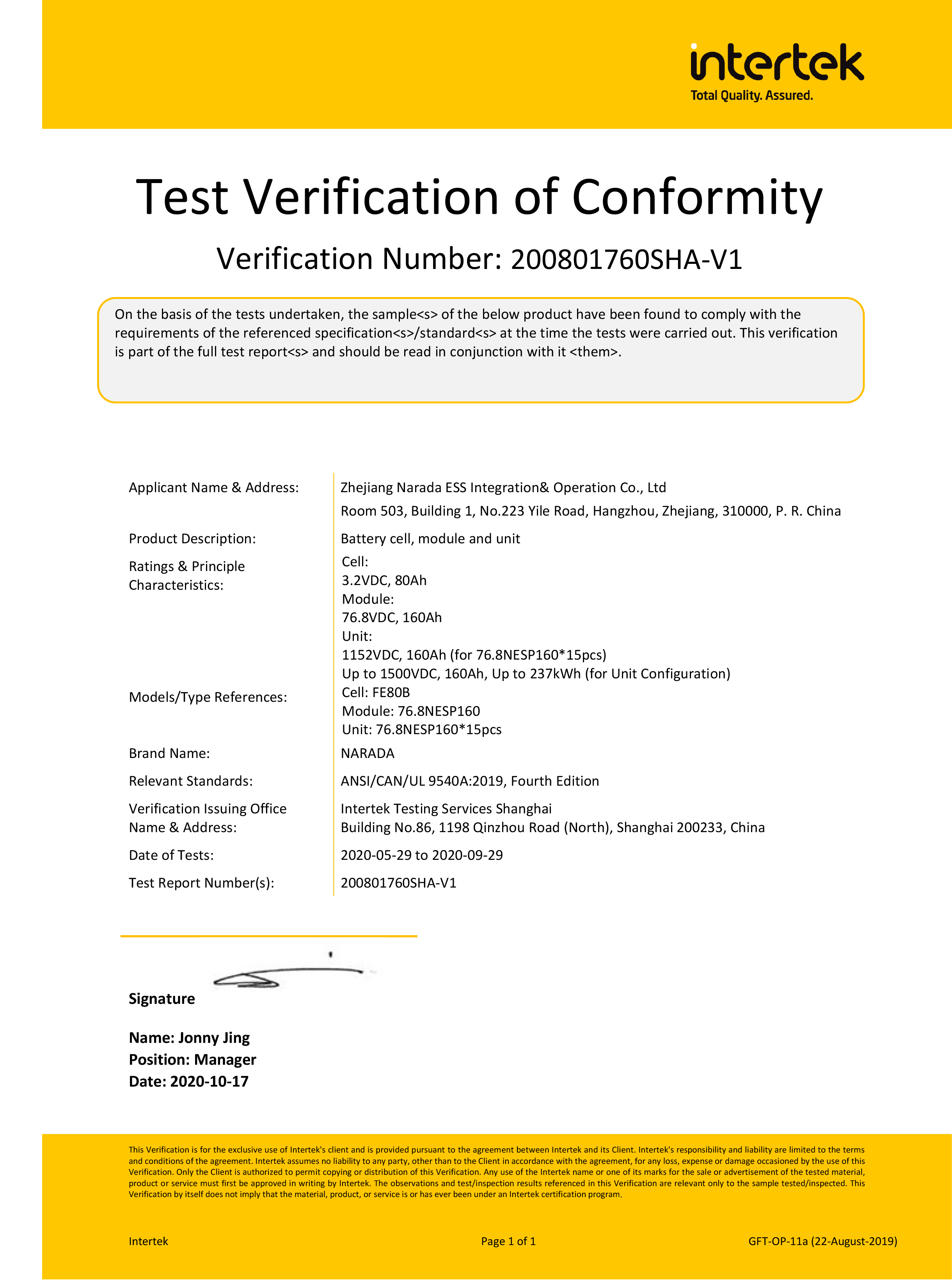 为全球第一批通过MW级集装箱储能系统UL9540、UL9540A认证的企业。通过UL9540、UL9540A认证,意味着南都储能系统在全球范围内具有极佳的认可度。